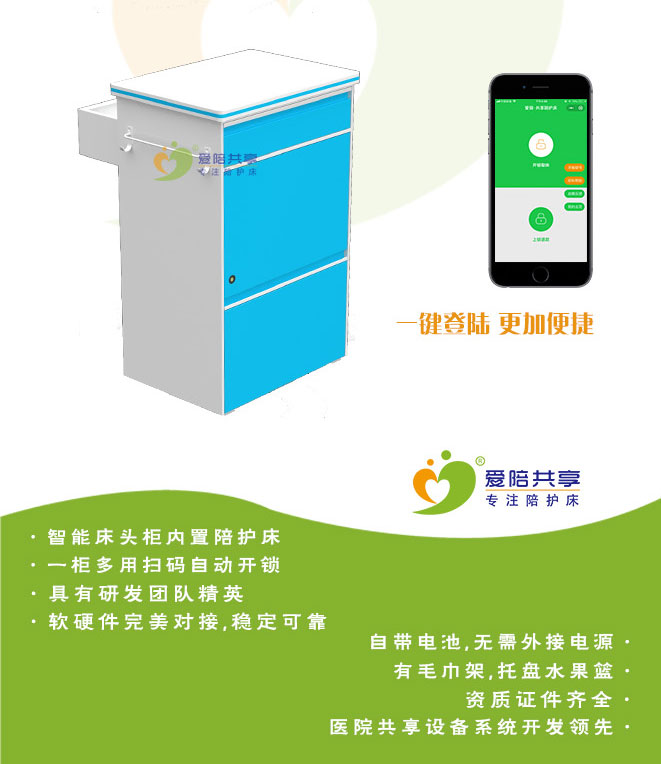 共享陪護(hù)床適用很多大醫(yī)院,可以選擇直接購置新型的設(shè)備為患者和家屬提供便利,也可以合作供應(yīng)商免費(fèi)進(jìn)行投放,在使用的過程中可為醫(yī)院以后的發(fā)展打下良好的基礎(chǔ)。共享陪護(hù)床是一款多功能的產(chǎn)品,即可當(dāng)床頭柜使用,又可做陪護(hù)床,相對成本價(jià)要高一些,但這種共享智能陪護(hù)床是未來的發(fā)展趨勢。愛陪共享陪護(hù)床咨詢:400-993-6038